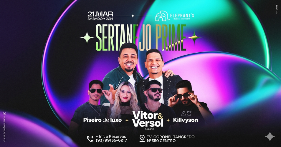 No dia 21 de março, o palco do Elephant’s Music Gastrobar recebe Vitor & Versol para um show envolvente, com repertório marcante, grandes sucessos e aquela energia que só o sertanejo de verdade entrega.
